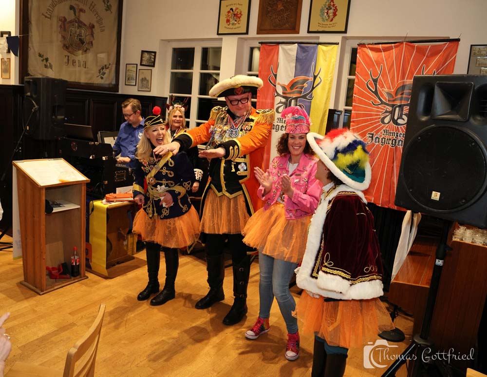 Und es gab noch eine ungeplante Aktion. Es stürmte eine durchaus hochrangige Damentruppe auf die Bühne: Dr. Gabi Ackermann (Präsidentin und Generalfeldmarschall Rheinisches Husarenregiment), Dr. Julia Peter (Generalfeldchirurg Aesculap Garde), Julia Döring (Sängerin) und Nina Stumps (Kommandeuse Freischützengarde). Sie meinten, es fehlt noch ein Amt in der Jägergarde: Vortänzer. Und so beförderten sie Bernd Frank zu eben jenem und er musste sein Talent sofort unter Beweis stellen: Er musste ein orangenes Tutu anziehen und den Damen Macarena vortanzen.